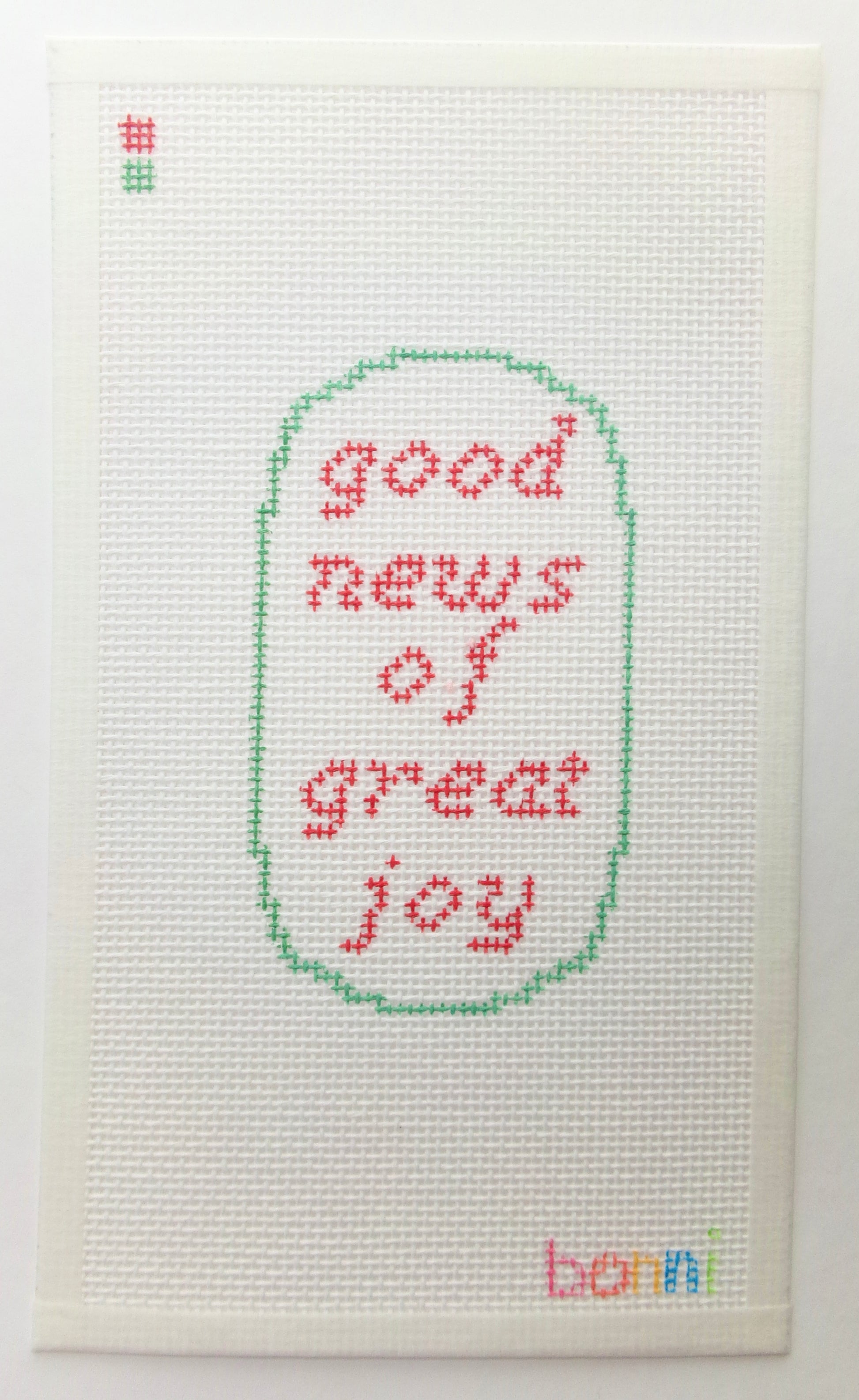 18 mesh, great beginner-friendly canvas. Can be kitted with embroidery floss, no need to strand it. Canvas size is 5x7”, design is 2x3.5"